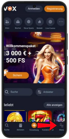 fnen Sie die offizielle Website von Vox Casino und gehen Sie zur Registerkarte „Menü“